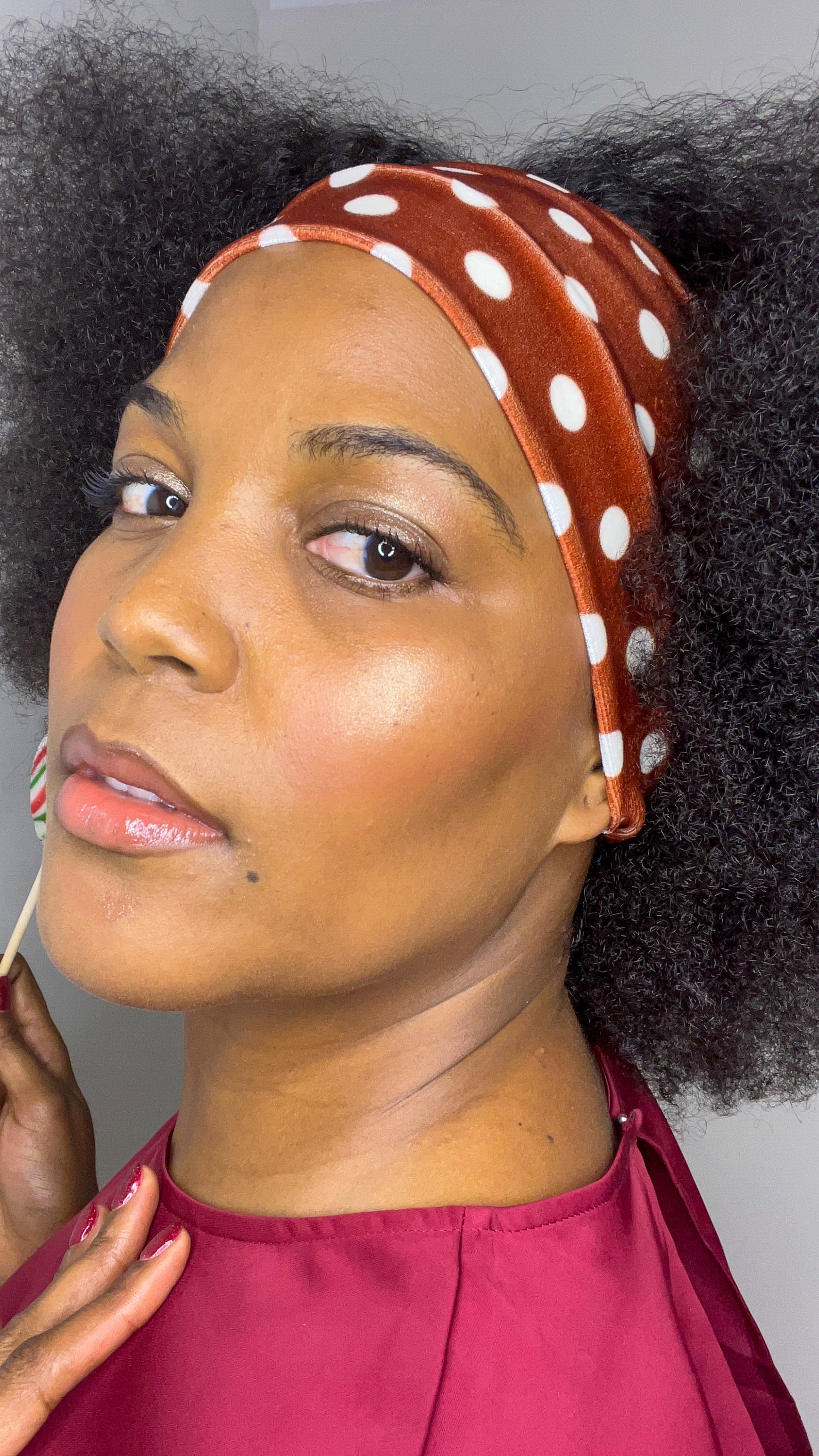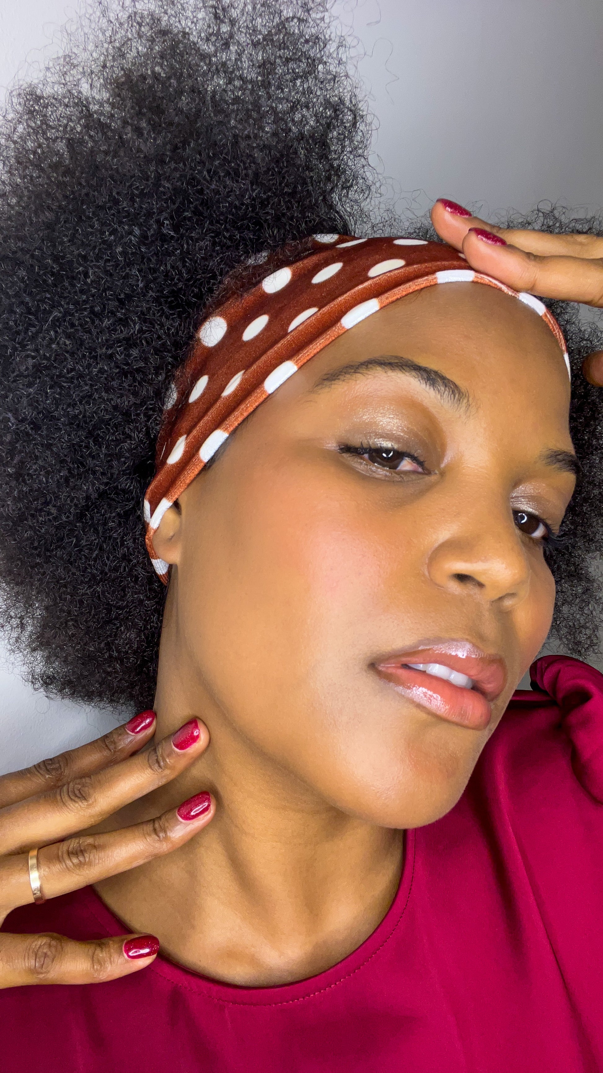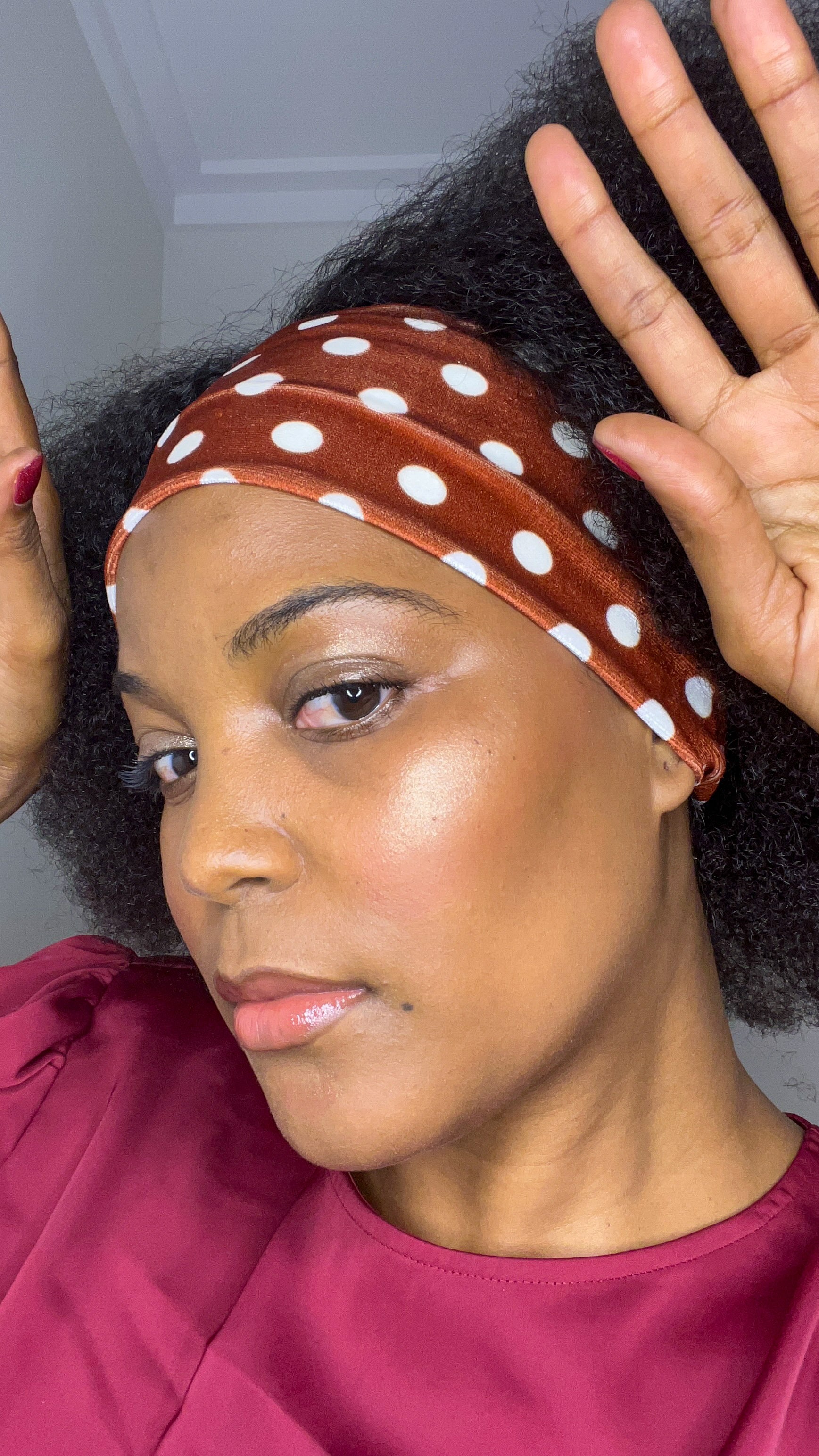 Faixa de cabelo com bolas brancas e fundo castanho em tecido veludo.